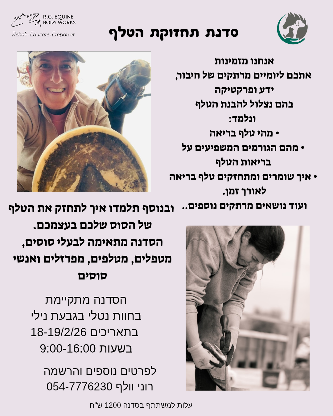 בסדנה נלמד לזהות טלף בריא, להבין את הגורמים המשפיעים על מצבו, ולרכוש כלים לתחזוקה נכונה לאורך זמן, מתוך הקשבה לגוף הסוס ולצרכיו.